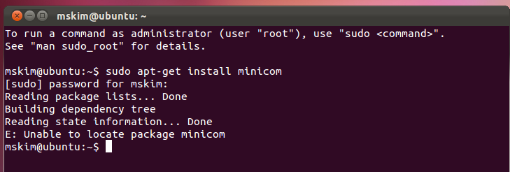 헉... 그런데 "E: Unagle to locate packge minicom"이라는 Error가 발생했다.