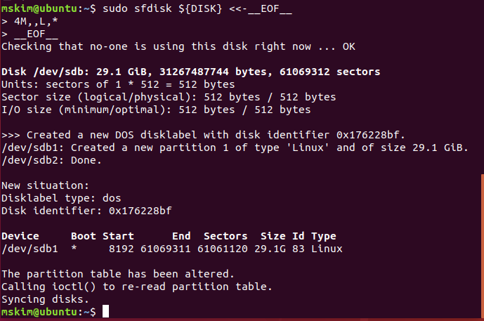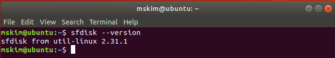 sfdisk >= 2.26x를 사용해야 하므로 다음과 같이 명령어를 실행한다.