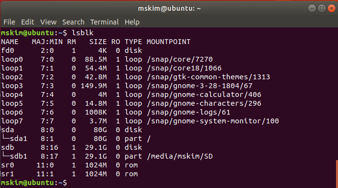 그 다음 SD카드를 삽입하고 동일하게 lsblk 명령어를 사용해서 다른 부분을 확인한다.