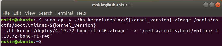sudo cp -v ./bb-kernel/deploy/${kernel_version}.zImage /media/rootfs/boot/vmlinuz-${kernel_version} |