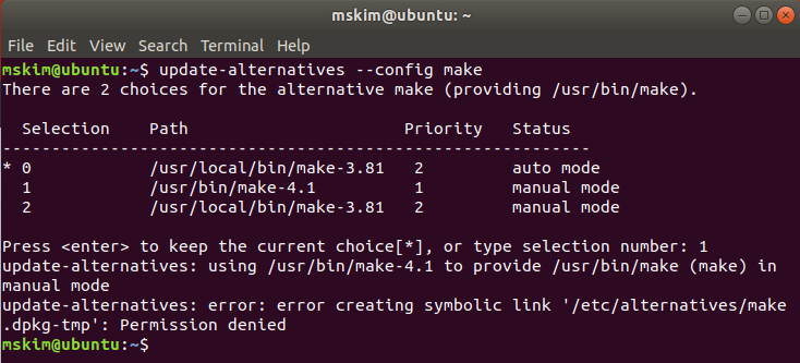 mskim@ubuntu:~$ sudo update-alternatives --install /usr/bin/make make /usr/bin/make-4.1 1