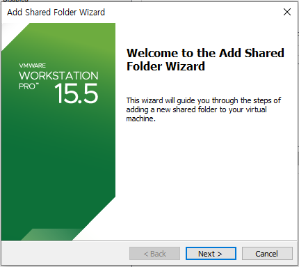 3. Floders에서 Add를 누르면 Add shared Folder Wizard가 뜬다. Wizard 창에서 Next를 누른다.