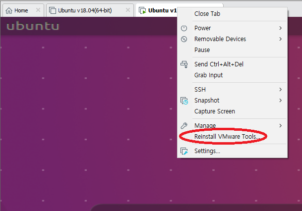 1. 로그인 하기 전에, 우분투를 구동 시킨 탭에서 오른쪽 클릭 후 Reinstall VMware Tools를 선택한다.