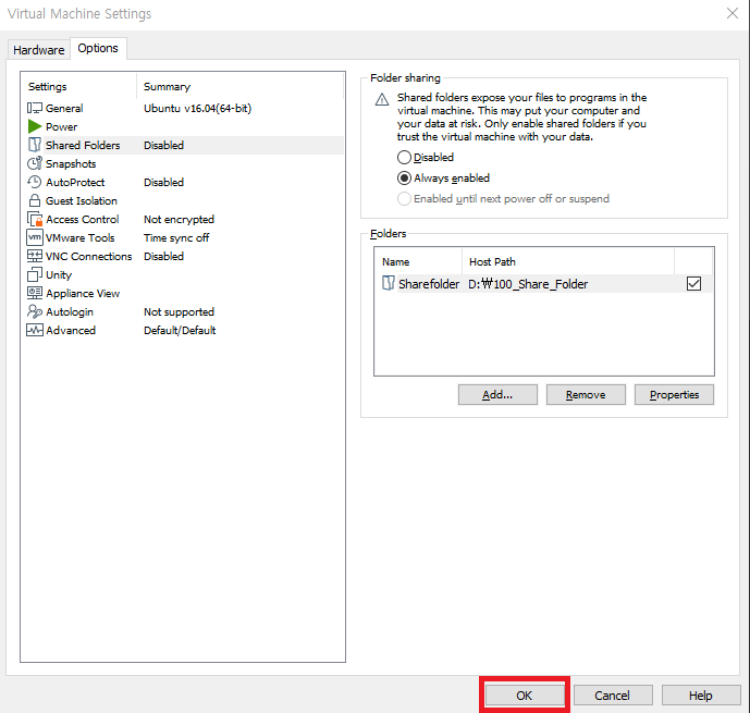 2. Options 탭을 선택 후 Shared Folders를 선택 그리고 나서 Folder sharing을 Always enabled로 선택한다.