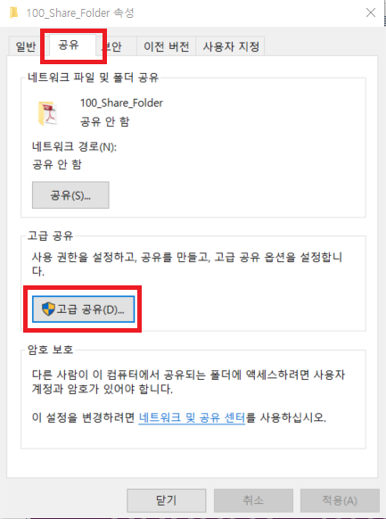 3. 공유 탭으로 이동 후 고급 버튼을 클릭