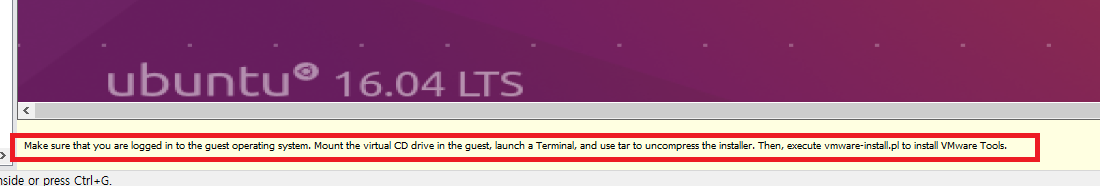 2. 화면 하단에 로그인을 하고 virtual CD drive를 Mount하고 Terminal을 띄워서 tar로 압축 파일을 풀은 후 vmware-install.pl 파일을 실행하라는 문구가 화면 하단에 뜬다. 이것을 확인하고 로그인을 한다.